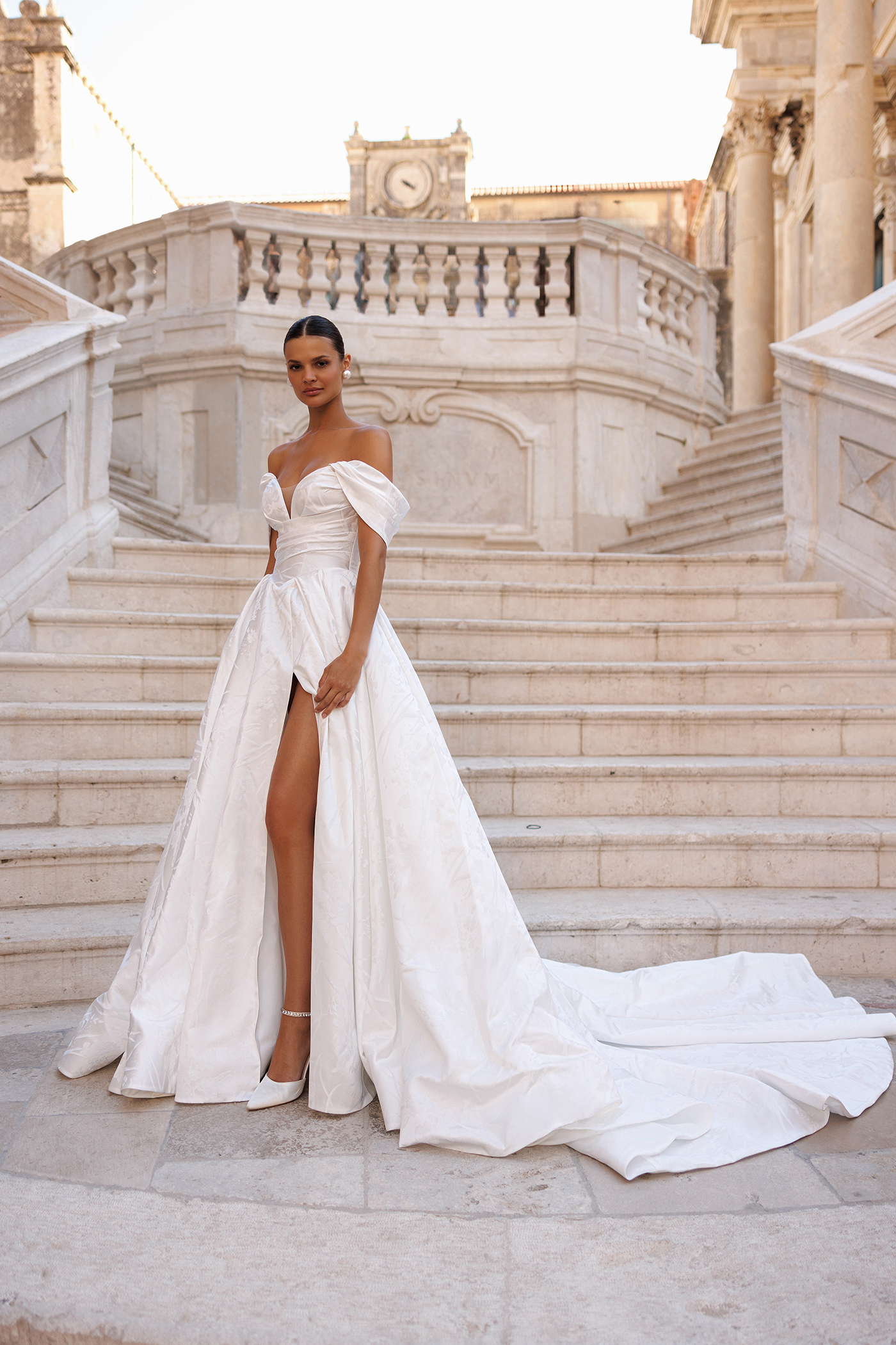 Rochie de mireasă A-line cu slit pe picior, realizată din tafta Mikado subțire, ideală pentru miresele care își doresc un look modern și rafinat. Modelul evidențiază talia printr-un corset structurat cu decolteu în V, oferind susținere și contur feminin. Fusta amplă, cu despicătură elegantă pe picior, adaugă lejeritate și senzualitate discretă, păstrând în același timp eleganța clasică.
